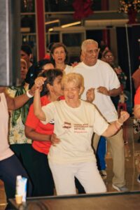 El evento incluyó una charla interactiva del reconocido geriatra Dr. Jim Clydderf, quien destacó la importancia de la actividad física para mantener la autonomía en la vejez. Le siguió una sesión de ejercicios funcionales guiada por el entrenador Carlos Crispín, y una animada clase de zumba dirigida por Rosanna Escaño, que cerró la jornada con música y movimiento.
